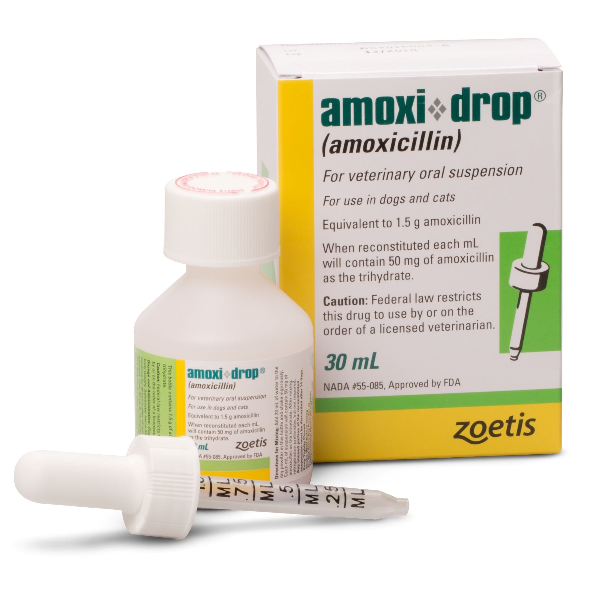 Earn 0 points with this purchase. Amoxicillin is a broad-spectrum penicillin antibiotic used to treat various infections caused by susceptible strains of bacteria. Tell your veterinarian if your pet is being given another antibiotic. Also tell your veterinarian if your pet has allergies, or kidney, stomach or intestinal disease. While symptoms may subside early, use all of the prescribed medicine. Amoxicillin Drops suspension is also available in a 15 ml bottle.