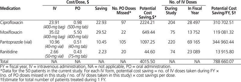 The primary endpoint was IV:PO ciprofloxacin use ratio. Ciprofloxacin is a fluoroquinolone antibacterial that is primarily active against aerobic gram-negative bacterial infections. In an effort to optimize use and minimize drug expenditures, ciprofloxacin has been designated a reserved antimicrobial drug RAD at our institution and has been included in the existing intravenous to oral IV-PO Step-down Program since. These services have demonstrated that cost savings can be achieved when pharmacists are directly responsible for changing the route of administration for selected medications. Paul's Hospital Google Scholar