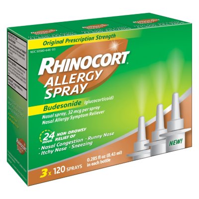 Temporarily relieves indoor and outdoor nasal allergy symptomsRelieves nasal congestion, sneezing, and runny nose and itchy noseDelivers 32 mcg of budesonide per sprayConvenient, once-daily dose works for 24 hoursFor adults and children. Rhinocort Allergy Spray, 0. Temporarily relieves indoor and outdoor nasal allergy symptoms Relieves nasal congestion, sneezing, and runny nose and itchy nose Convenient, once-daily dose works for 24 hours For adults and children. Temporarily relieves indoor and outdoor nasal allergy symptoms.